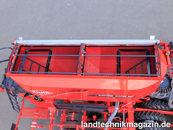 Im 3.750 respektive 5.000 l fassenden Behälter findet sich eine mobile Trennwand, um die Dünger-Saatgutaufteilung variieren zu können. Kuhn beziffert das Fassungsvermögen der ESPRO M 3000 C mit 2.350/1.200 l oder 1.875/1.875 oder 1.100/2.330, das der ESPRO M 4000 C mit 3.350/1.650 l oder 2.500/2.500 l oder 1.500/3.250 l. Trotz des eher spartanischen Aufbaus der neuen ESPRO M 3000 C und ESPRO M 4000 C bieten die beiden Drillmaschinen die HELICA-Saatgutdosierung, die Düngerverteilung MAXIMA oder die Saatüberwachung und Fahrgassenschaltung über die Bedienkonsole HECTOR.
