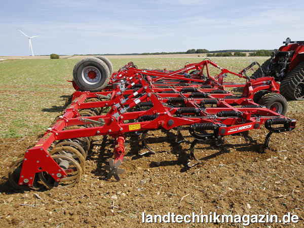 Der neue Horsch Terrano 12 FM arbeitet mit 45 TerraGrip III Zinken, die einen Strichabstand von 27 und einen Zinkenabstand von 108 cm in der Reihe aufweisen. Der Zinkenabstand soll guten Durchgang gewährleisten, während der üppige Strichabstand für Leichtzügigkeit auch bei tieferer Bodenbearbeitung sorgen soll. Die Zinken selbst stammen aus dem Horsch Focus TD und verfügen über eine Auslösekraft von 550 kg. Sternförmige Hohlscheiben, von Horsch als Einebnungsseche bezeichnet, sollen den Erdstrom nach den Zinken beruhigen und hinter dem Mittelfahrwerk rückverfestigt ein Doppel-RollPack-Packer den Boden.