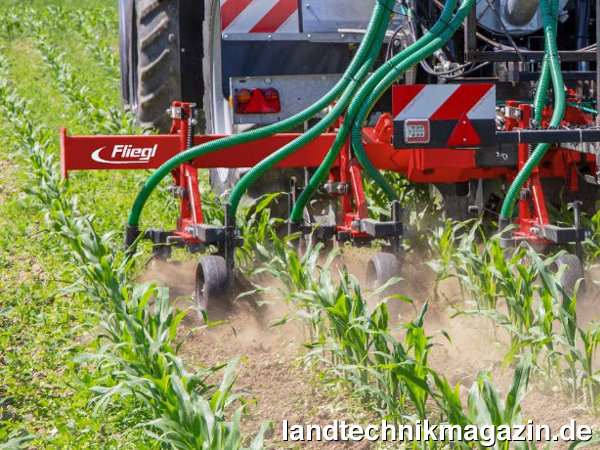Die mechanische Beikrautregulierung liegt in jüngster Zeit aus den verschiedensten Gründen wieder im Trend. Ebenso steigt – auch bedingt durch schärfere Regulierungen der Gülledüngung – das Interesse, die Gülleausbringung in Reihenkulturen während der Hauptwachstumsphase im Mai und Juni durchzuführen. Mit dem Dexter geht Fliegl auf beide Anforderungen aus der Praxis ein und präsentiert ein Gerät, mit dem zwei Arbeitsschritte, die zeitlich gut zusammenpassen, in einem Vorgang erledigt werden können.