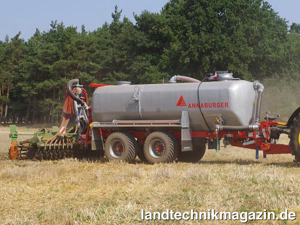 Serienmäßig liefert Annaburger den ProfiTanker Plus HTS 24.28 mit einer Drehkolbenpumpe vom Typ VX 186 - 184Q mit einer Förderleistung (Herstellerangabe) von 3.845 l/min. Deren Anschluss liegt vorne im Behälter-Boden, so dass durch Absenken der hydraulisch gefederten Deichsel der Tank restlos entleert werden kann. Die Druckleitung von der Pumpe zum Verteiler ist aus Gewichtsgründen ebenfalls aus GfK gefertigt und verläuft durch den Tank.