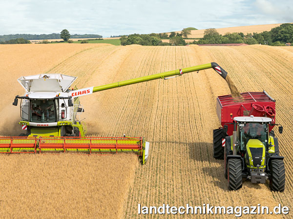 Beim Controlled-Traffic-Anbau-Verfahren erfolgen alle Schritte von der Bodenbearbeitung über Aussaat und Pflanzenschutz bis hin zur Ernte auf einmalig für die Ackerfläche festgelegten Fahrspuren. Neben einer Verbesserung der Bodenstruktur und des Erosionsschutzes soll sich so auch eine bessere Nutzung des im Boden verfügbaren Wassers ergeben. Vor allem auf Trockenstandorten in Australien ist dieses Verfahren deshalb verbreitet, während es in Europa und insbesondere in Deutschland derzeit praktisch noch bedeutungslos ist. Dessen ungeachtet beweist Claas hier Optimismus und bietet auch hierzulande zukünftig das neue 7XL Abtankrohr an. Mit einer Gesamtüberladeweite von laut Claas 12 m ist das neue 7XL Abtankrohr auf 12-m-Spursysteme im Controlled-Traffic-Anbau-Verfahren ausgelegt. Das 7XL Abtankrohr wurde laut Claas auf Basis des bislang größten Auslaufrohres 4XL komplett neu konstruiert. Um die enorme Überladeweite zu realisieren, verfügt das 7XL über ein 2,11 m langes Endstück, das für Transportfahrten um 120 Grad hinter den Mähdrescher geklappt wird. Die Bedienung des neuen Abtankrohres erfolgt über die gewohnten Taster am CMOTION-Multifunktionshebel, wobei ein Sicherheitsmechanismus das Ein- und Ausklappen des Endstückes nur bei komplett eingeschwenktem Abtankrohr freigibt.