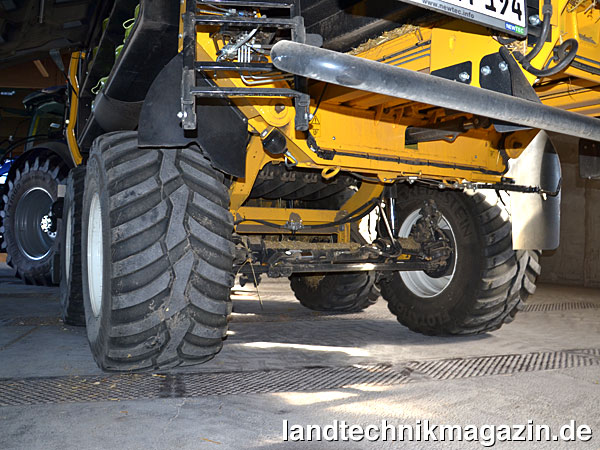 Eine weitere Besonderheit der New Holland BigBaler 1290 High Density Quaderballenpresse ist das Achskonzept, bei dem eine hydraulische Federung mittels zweier Stickstoffblasen realisiert wird. Vorder- und Hinterrad sind hydraulisch verbunden und reagieren gegenläufig: weicht das Vorderrad nach oben aus, wird das Hinterrad auf der gleichen Seite nach unten gedrückt. Nebeneffekt dieses Fahrwerkes ist, dass die komplette Ballenpresse durch einen Hydraulikblock auf beiden Seiten angehoben oder gesenkt werden kann, um beispielsweise den Zugang zu den Garnkästen (oder den Messern) zu erleichtern. Neu zur Saison 2021 ist eine 60-km/h-Version.