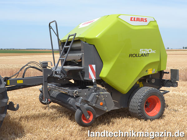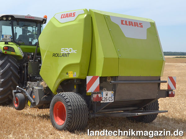 Eine um 15 % höhere Pressdichte verspricht Claas bei der neuen ROLLANT 520 durch das neue Walzenkonzept mit 16 verstärkten, die Presskammer bildenden Walzen. Jeweils acht dieser Walzen sind laut Claas aus Stahlblech mit 3 respektive 4 mm Dicke geformt. Auch unter feuchten Bedingungen soll das geriffelte Profil der beidseitig angetriebenen Walzen eine perfekte Ballenrotation gewährleisten. Die Lagerung – laut Claas mittels großdimensionierter Lager – und der Antrieb der Walzen erfolgen bei der ROLLANT 520 analog zu den Claas Festkammerpressen ROLLANT 540 und 620 jetzt über angeflanschte Achsstummel. Walzen und Achsstummel können so bei Bedarf separat ausgetauscht werden. Der Pressdruck wird bei der ROLLANT 520 über die Schließzylinder der Heckklappe eingestellt, die laut Claas für hohe Ballendichten mit bis zu 150 bar beaufschlagt werden können. Für die ROLLANT 520 RF und ROLLANT 520 RC bietet Claas zudem das bekannte MPS II System an, bei dem ein Segment mit drei Presswalzen in die Kammer geschwenkt werden kann, um eine zusätzliche Verdichtung des Ballens, eine frühere Ballenrotation und eine gleichmäßigere Form zu erzielen.