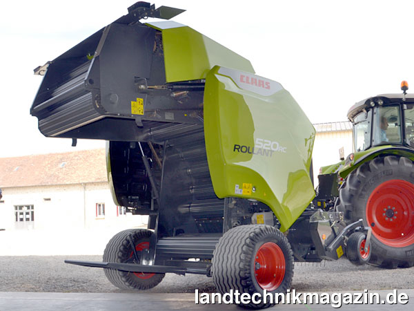 Rotor, Hauptantrieb und Heckklappenwalzen verfügen über 1-Zoll-Antriebsketten. Die Kettenschmierung erfolgt bei Class’ neuer Festkammerpresse jetzt über eine einstellbare Exzenterpumpe – wie Claas betont, bedarfsgerecht und nicht durchsatzabhängig –, die das Öl aus einem Vorratstank mit nach Herstellerangaben 4 l Inhalt bezieht. Die Bedienung der neuen ROLLANT 520 erfolgt über das Claas OPERATOR Terminal. Bleibt noch zu erwähnen, dass Claas das Design seines Rundballenpressen-Basismodells deutlich modernisiert hat.