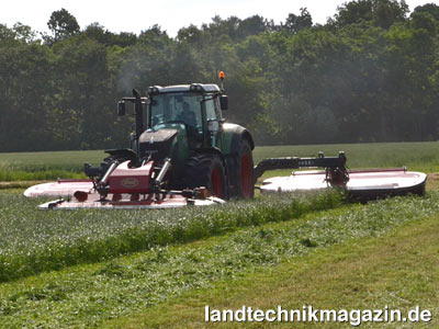 Beim Vorstrecker mit e-Twin-Technologie werden die beiden 750 mm breiten Folien mit einer 2/3-Überlappung zu einer Doppellage zusammengeklebt, bevor sie den Vorstrecker verlassen. Das führt laut Kuhn zu 50 % Zeitersparnis beim Wickeln und durch die größere Vorstreckung zu entsprechender Einsparung bei der Folie. Die auf 800 mm Höhe vorgestreckte Folie soll außerdem für weniger Faltenbildung am Ballen und eine perfekte Folienüberlappung sorgen. Zudem ergibt sich durch den Vorstrecker mit e-Twin-Technologie laut Kuhn eine hohe Reißfestigkeit der Folie bei warmer Witterung. Insgesamt sollen die Ballen auch fester umwickelt sein, wodurch sich der Luftabschluss und damit die Futterqualität verbessern.