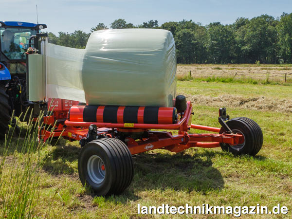 Um einen tiefliegenden Wickeltisch zu ermöglichen und so auf eine aktive Ablagedämpfung verzichten zu können, hat Kuhn bei den neuen Rundballen-Wickelgeräten RW 1410 und RW 1610 die Radachse am hinteren Ende der Maschinen angeordnet. Durch den besonders tief liegenden Wickeltisch können die Ballen laut Kuhn problemlos während der Fahrt abgelegt werden. Wegen des neuen Rahmens und des Folienschneiders sind die vier Riemen am Drehtisch des RW 1610 laut Kuhn in der Lage, schwerste Ballen bis zu einem Gewicht von 1.200 kg aufzunehmen. Dabei wird nach Herstellerangaben stets Gewicht auf den Traktor verlagert, um ein Abrutschen der Räder in hügeligem Gelände zu vermeiden.