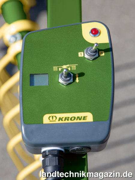 Bei den Kreiseln greift Krone auf bewährte Komponenten aus dem hauseigenen Baukasten zurück. So verfügen auch die neuen Swadro Highland über wartungsfreien Kreiselgetriebe, wartungsfreie, dauergeschmierte Zinkenarmlagerungen sowie die ebenfalls wartungsfreie DuraMax-Kurvenbahn. Neu ist hingegen der Highland-Lift-Zinken mit laut Krone 510 mm Zinkenlänge. Der neue Zinken basiert auf dem bekannten Krone Lift-Zinken, wurde jedoch nach Herstellerangaben auf die besonderen Bedingungen in Hanglagen und Bergregionen optimiert. Durch seine abgewinkelte Form soll er einerseits länger in Arbeitshöhe verbleiben – um Rechverluste zu reduzieren – und andererseits das Futter anheben, so dass Futterverschmutzungen minimiert werden sollen. Die Rechhöhe wird bei den neuen Schwadern Swadro S 350 Highland und Swadro S 380 Highland per Handkurbel inklusive Anzeigeskala manuell eingestellt. Als Option bietet Krone eine elektrische Verstellmöglichkeit von der Schlepperkabine aus an. Ebenfalls als Wunschausstattung gibt es eine hydraulische Schwadtuchklappung und -verstellung. Neben der komfortablen Verstellung der Schwadbreite von der Kabine aus, gestattet diese auch den bequemen Wechsel von Transport- in Arbeitsstellung und umgekehrt. Dabei wird das Schwadtuch für den Transport auf die Maschine geklappt, um Beschädigungen sicher zu verhindern. Stichwort Transport: Der Kreiseldurchmesser beträgt beim Swadro S 350 Highland nach Herstellerangaben 2,70 m, beim Swadro S 380 Highland 2,96 m. Fünf der zehn Zinkenarme können bei beiden Modell eingeklappt werden, so dass beide neuen Schwader laut Krone auf eine minimale Transportbreite von lediglich 1,85 m kommen.
