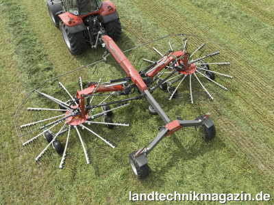 Der neue Einkreisel-Schwader TOP 422 A verfügt Pöttinger zufolge über 4,20 m Arbeitsbreite, der neue 462 A über 4,60 m Arbeitsbreite. Um den Einsatz mit kleineren Traktoren zu erleichtern, werden die beiden Schwader gezogen, auch das An- und Abkuppeln soll einfach sein. Die Parallelogramm-Deichsel beider neuer Schwadkreisel erlaubt eine Anhängung an Ackerschiene oder Zugpendel. Hydraulikzylinder an Deichsel und Fahrwerk bewirken nach Herstellerangaben eine Bodenfreiheit von 50 cm. Die hydraulische Transportaushebung wird vom Traktorsitz aus bedient. Für eine bessere Bodenanpassung setzt Pöttinger auf Tandemachsen – für einen ruhigeren Straßentransport gehören Ballonreifen (18,5 x 8,58) zur Serienausstattung.