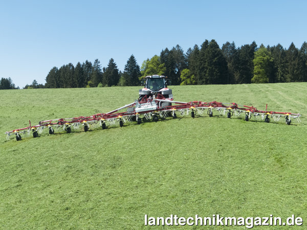 Wie bei anderen Pöttinger Zettwendern kommen auch im neuen Modell die bekannten DYNATECH Kreisel zum Einsatz, deren Durchmesser beim HIT 16.18 T vom Hersteller mit 1,42 m angegeben wird. Die Kreisel verfügen über sechs geschwungene Zinkenarme, die laut Pöttinger das Futter sauber aufnehmen und durch den idealen Streuwinkel ein perfektes Streubild ermöglichen. Für eine schonende Futteraufnahme sollen die nachlaufenden, die Zinken ziehenden Arme sorgen, für eine gleichmäßige Aufnahme sind die Zinkenschenkel ungleich lang.