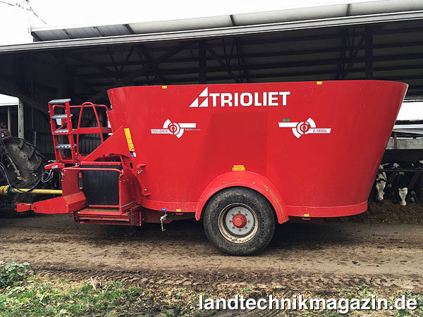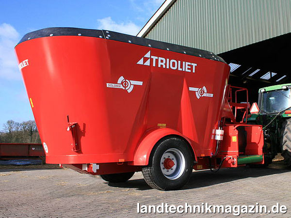 Die Achse ist bei den neuen Trioliet Solomix 2 VLL New Edition Futtermischwagen mittig unter dem Mischbehälter platziert. Die schmale Mischwanne ermöglicht eine Anordnung der Räder neben dem Mischbehälter. Insgesamt soll sich so ein kompakter und wendiger Mischwagen ergeben, der sich auch für niedrige und kleine Ställe eignet. Runde und abgeschrägte Kotflügel verhindern Futterablagerungen, eine neue Leiter mit Plattform sowie stirnseitige Fenster im Mischbehälter ermöglichen eine optimale Kontrolle der Befüllung und des Mischvorganges.