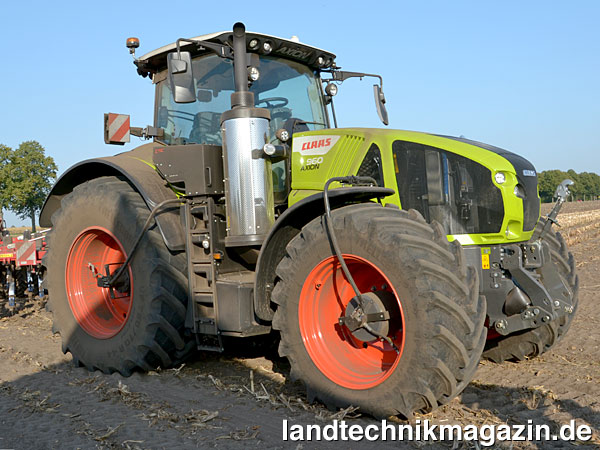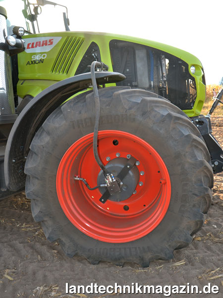 Traktion ist bei den AXION 900 Traktoren ein großes Thema: Einerseits bietet Claas die Modelle 930 und 960 als vollgefederte Halbraupen-Traktoren (die auch mit den breitesten Bändern unter 3 m Außenbreite bleiben) an und andererseits lassen sich die Radtraktoren seit 2017 mit 44-Zoll-Reifen auf der Hinterachse ausrüsten; Vorder- und Hinterachse sind für den Betrieb mit Zwillingsrädern freigegeben. Einen weiteren konsequenten Schritt in diesem Themenkomplex stellt die neue, ausschließlich für die AXION 900 mögliche werksseitige Vorrüstung für die CTIC Reifendruckregelanlagen (CTIC und CTIC 2800) mit ISOBUS-Bedienung dar. Ohne im Detail die Vorteile des veränderbaren Reifendrucks in Bezug auf Bodenschonung zu erläutern, sind Reifendruckregelanlagen zweifellos ein technisches Feature, dass die Bodengesundheit und damit die Nachhaltigkeit landwirtschaftlichen Arbeitens enorm steigern können. Claas bietet mittlerweile die Reifendruckregelanlagen CTIC und CTIC 2800 an, die sich durch die Luftfördermenge unterscheiden: CTIC arbeitet ohne zusätzlichen Kompressor, CTIC 2800 umfasst einen Schraubenkompressor, der nach Unternehmensangaben einen Luftstrom von 2.800 l/min erzeugt. Gesteuert werden beide Systeme über das CEBIS Touchterminal oder ISOBUS-Universalterminals wie das CEMIS 700 oder das S10.