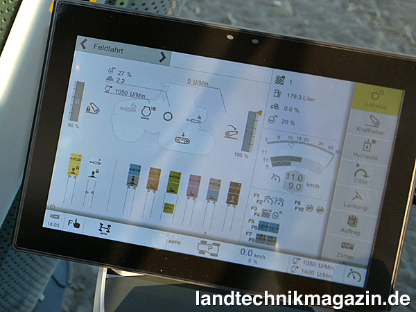 Diese digitale Integration des CTIC ist durchaus überzeugend: Neben der Option, die Bedienung der Reifendruckregelanlage bei entsprechender Einstellung auf Funktionstasten der Bedienarmlehne oder den CMOTION Fahrhebel zu legen, kann die CTIC Ansteuerung in die optionale CEMOS Maschinenoptimierung eingebunden werden. Das Assistenzsystem CEMOS führt durch einen Fragenkatalog, mit dessen Hilfe die Art des Bodens, die Witterungsverhältnisse und die bevorstehende Arbeit untersucht werden, macht Vorschläge zur Ballastierung und berechnet anhand der gewählten Einstellungen den richtigen Reifendruck – der dann auch direkt eingestellt wird. Mit der vom CTIC 2800 erzeugten Luftmenge lassen sich übrigens nicht nur die Traktorreifen befüllen, sondern auch die des angebauten Gerätes, weshalb das CTIC-System jetzt auch eine integrierte Regelung der Reifeninnendrücke der (mit Leitung ausgestatteten) Anbaugeräte umfasst.