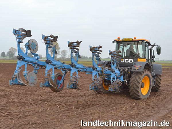 Serienmäßig wird der Fastrac 4000 mit Vorderradlenkung geliefert, optional lässt er sich mit Quadtronic 4-Rad-Lenkung bestellen. Hat man sich für diese Sonderausrüstung entschieden, stehen fünf verschiedene Lenkarten zur Verfügung, die mit einem extra Wahlschalter in Verbindung mit dem Touchscreen ausgewählt werden: Vorderradlenkung, Allrad-Proportionallenkung, Gleichlauflenkung, verzögerte Allradlenkung und Hundeganglenkung. Bei der Allrad-Proportionallenkung beträgt die Übersetzung Vorderachse/Hinterachse 2:1, das heißt die Vorderachse lenkt bis zu 40°, die Hinterachse proportional dazu bis zu 20°. Bei der Gleichlauflenkung lenken Vorder- und Hinterräder zunächst gleichmäßig bis 20° Lenkeinschlag, anschließend können die Vorderräder weiter bis 40° gelenkt werden. Beim Verzögerungsmodus kann ein Vorderradwinkel vorgewählt werden, ab dem die Hinterräder zu lenken beginnen. Bei der Hundeganglenkung lenken Vorder- und Hinterräder mit gleichem Lenkwinkel in Lenkrichtung bis zu 20°, danach können die Vorderräder weiter bis 40° eingeschlagen werden. Als Wunschausstattung steht auch die Fast Steer Schnell-Lenkung zur Verfügung, mit der die Lenkradumdrehungen von Anschlag zu Anschlag von 4 auf 2 reduziert werden, was schnellere Wendemanöver am Vorgewende ermöglicht. Den Wendekreis mit Reifen der Dimension 540/65 R30 an beiden Achsen beziffert JCB mit 9,8 m. Apropos Reifen: Die neue Fastrac Serie 4000 kann im Vergleich zur Serie 2000 mit größeren Reifen bis zur Dimension 540/65 R34 oder 600/70 R30 an beiden Achsen bestückt werden. Darüber hinaus bietet JCB auch eine asymmetrische Bereifung an mit Reifen der Größe 540/65 R34 an der Vorderachse und 600/70 R30 an der Hinterachse. Ebenso ist eine Pflegebereifung in der Grüße 380/85 R38 lieferbar.