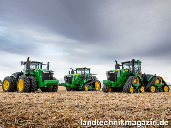 John Deere beziffert die Maximalleistung nach ECE-R120 für den 9R 440 mit 356/484 kW/PS, für den 9R/9RX 490 mit 396/539 kW/PS, für den 9R/9RX 540 mit 437/594 kW/PS, für den 9R/9RX 590 mit 477/649 kW/PS und für den 9R/9RX 640 mit 508/691 kW/PS. Bei den Raupentraktoren gibt John Deere die Maximalleistung nach ECE-R120 mit 380/517 kW/PS für den 9RT 470, mit 421/572 kW/PS für den 9RT 520 und mit 461/627 kW/PS für den 9RT 570 an.